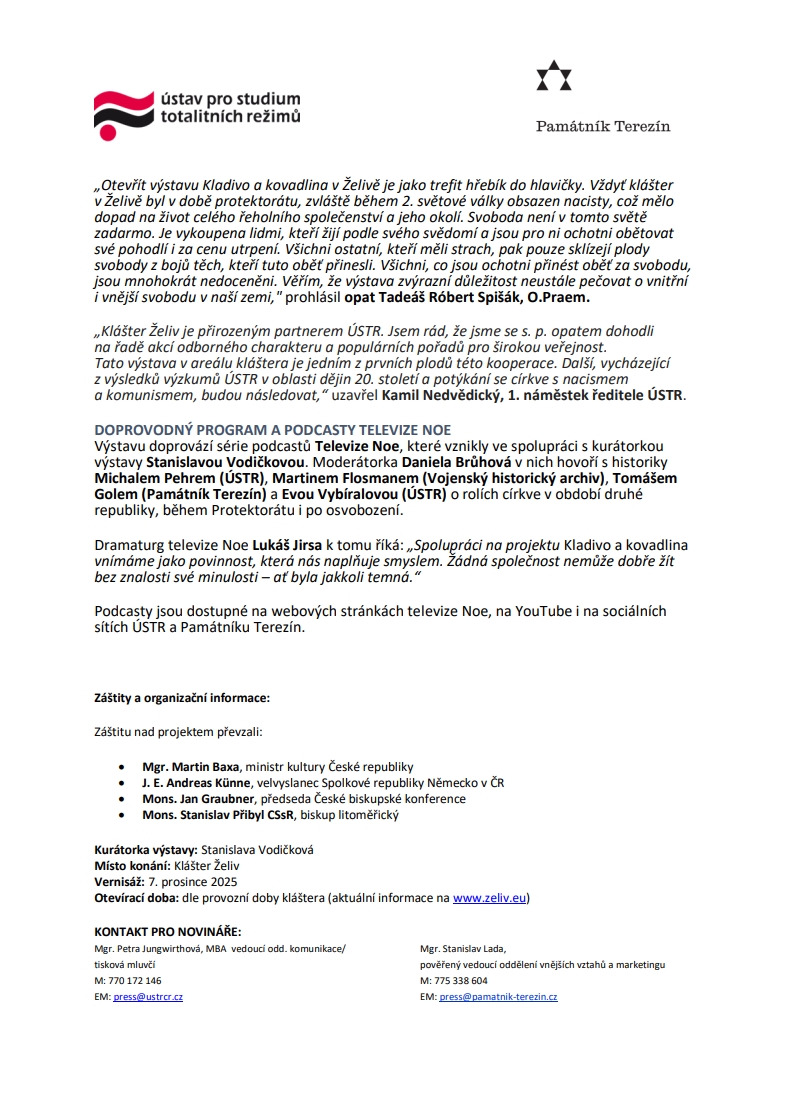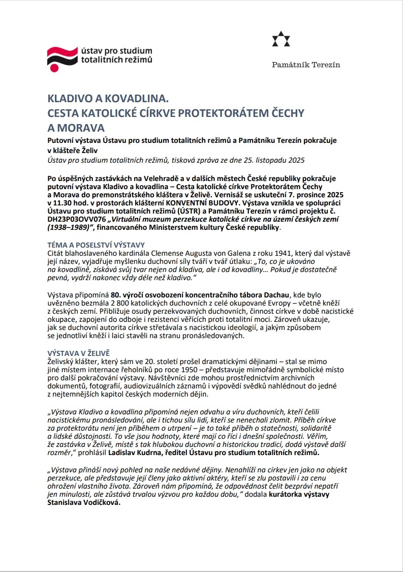 Do Kláštera Želiv přichází významná putovní výstava Kladivo a kovadlina, která představuje příběhy kněží, řeholníků i laiků čelících nacistickému útlaku v době Protektorátu Čechy a Morava. Výstavu připravil Ústav pro studium totalitních režimů ve spolupráci s Památníkem Terezín a připomíná mimo jiné 80. výročí osvobození koncentračního tábora Dachau, kde trpěly tisíce duchovních z celé Evropy.
